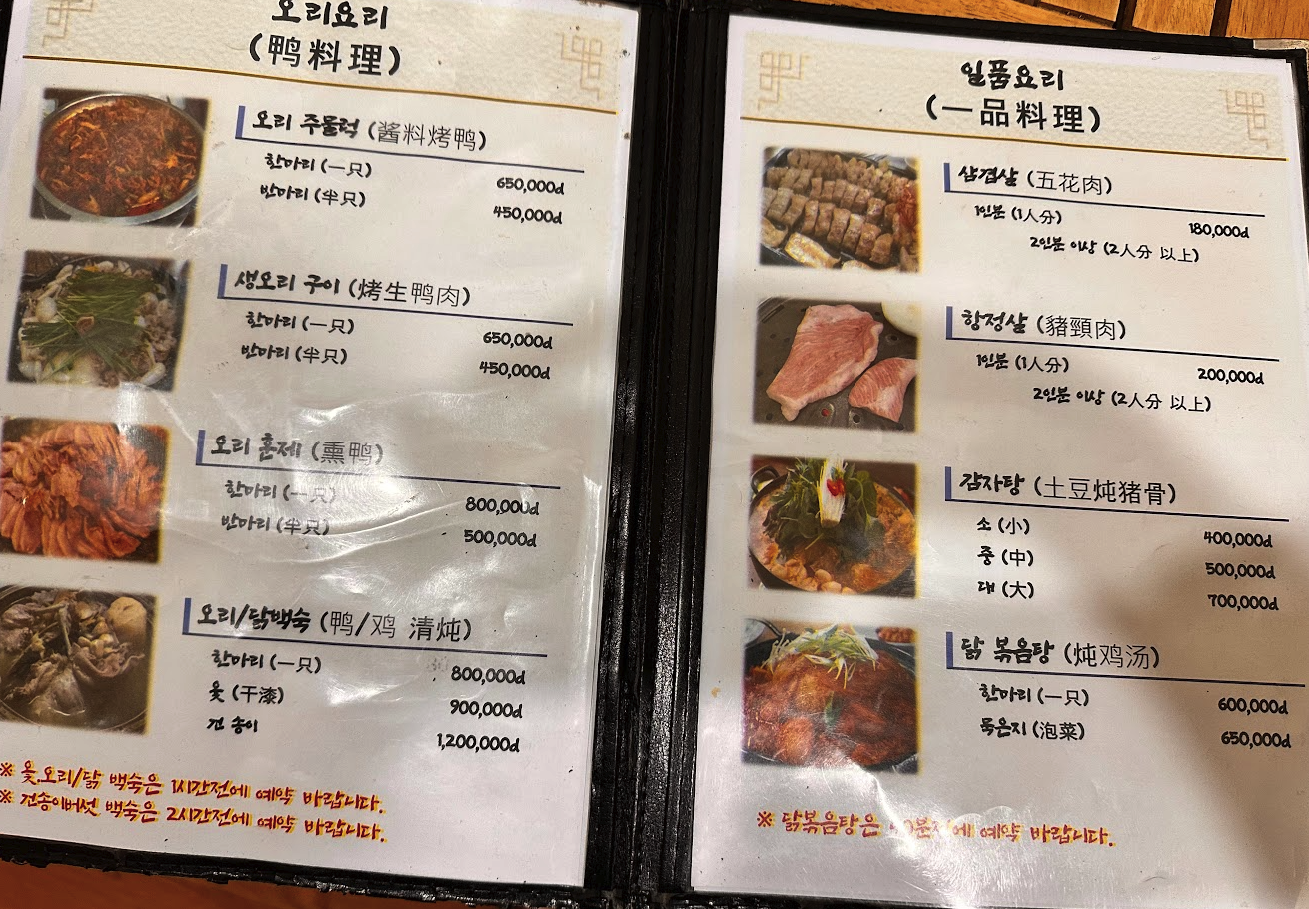 간판으로 되어 있는 메뉴 입니다. 닭과 오리 뿐만 아니라 감자탕도 메뉴에 있었습니다.