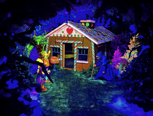 유명한 동화인 헨젤과 그레텔 입니다. 두 오누이가 있고 과자로 만들어진 집, 마녀가 표현 되어 있습니다.